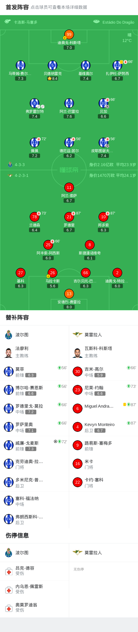 北京时间3月16日葡萄牙足球超级联赛 联赛 第26轮,波尔图主场对阵莫雷拉人。波尔图贝加破门,皮耶图谢夫斯基破门,威廉-戈麦斯破门。最终比分波尔图 3-0 莫雷拉人。精彩瞬间第14分钟,波尔图球员贝加打入一球。第25分钟,波尔图球员弗罗霍尔特助攻皮耶图谢夫斯基打入一球。第81分钟,波尔图球员弗罗霍尔特助攻威廉-戈麦斯打入一球。球队阵容技术统计...